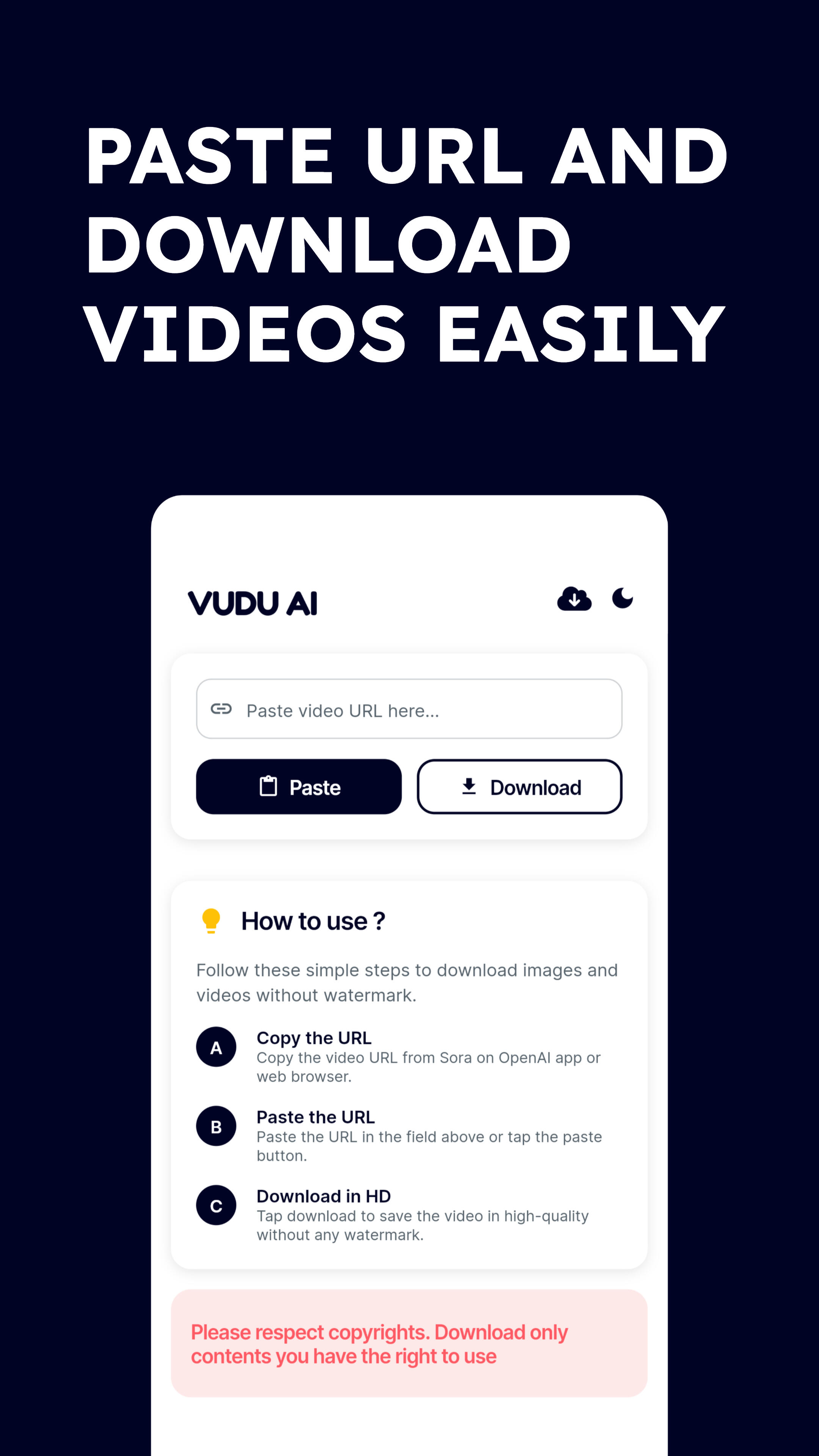 The app delivers clean video output while preserving quality. VUDU AI is designed strictly for personal use and does not alter or distribute third-party content. Users remain responsible for ensuring they have permission to download and use the content.